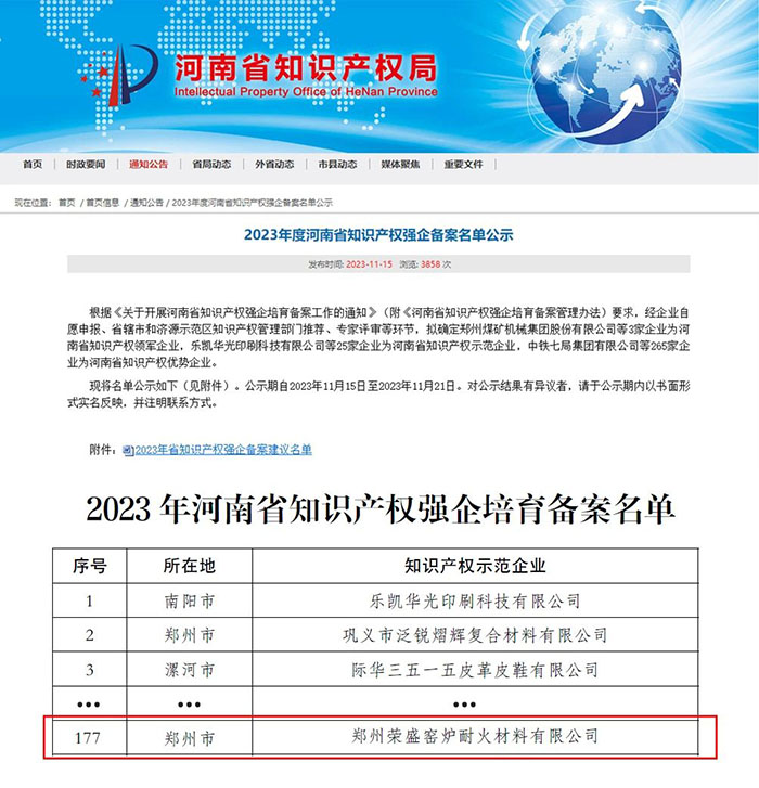 近日,河南省知識(shí)產(chǎn)權(quán)局公布2023年度河南省知識(shí)產(chǎn)權(quán)強(qiáng)企備案名單,鄭州榮盛窯爐耐火材料有限公司(以下簡稱「榮盛耐材」)榮獲「知識(shí)產(chǎn)權(quán)優(yōu)勢企業(yè)」稱號(hào),知識(shí)產(chǎn)權(quán)綜合實(shí)力獲官方認(rèn)可。這是今年以來,榮盛耐材在知識(shí)產(chǎn)權(quán)領(lǐng)域獲得的又一項(xiàng)榮譽(yù)。
