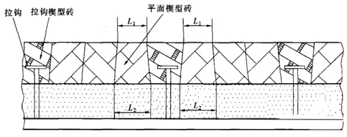 如圖8所示,為拉鉤楔形磚結構形式,是利用楔形拉鉤磚的角度,使兩塊楔形拉鉤磚之間的平面楔形磚的L1均小于L2,使其脫出困難,可確保運行的。主要用在分離器的圓筒部分及錐段部分。