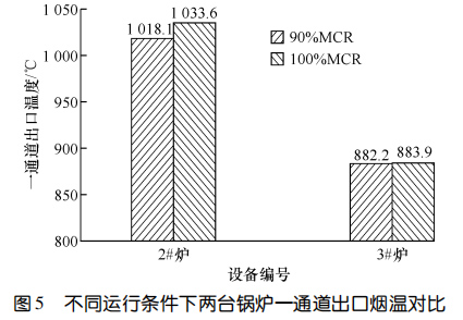 兩臺設備運行 11 個月后進行了能效測試。圖5對比了 90%鍋爐大的連續蒸發量(簡稱 MCR)和100%MCR 條件下鍋爐一通道的出口煙溫。圖6示出了100%MCR運行條件下兩臺鍋爐熱效率的對比。結果顯示:在 90%MCR 運行條件下,3#爐一通道出口煙溫比2#爐低 135.9 ℃,在100%MCR 運行條件下,3#爐一通道出口煙溫比 2#爐低 149.7 ℃,3#爐的熱效率比 2#爐高 0.64%。相較而言,使用膜式壁爐襯的3#爐在負荷相當的情況下,余熱鍋爐熱效率更高。